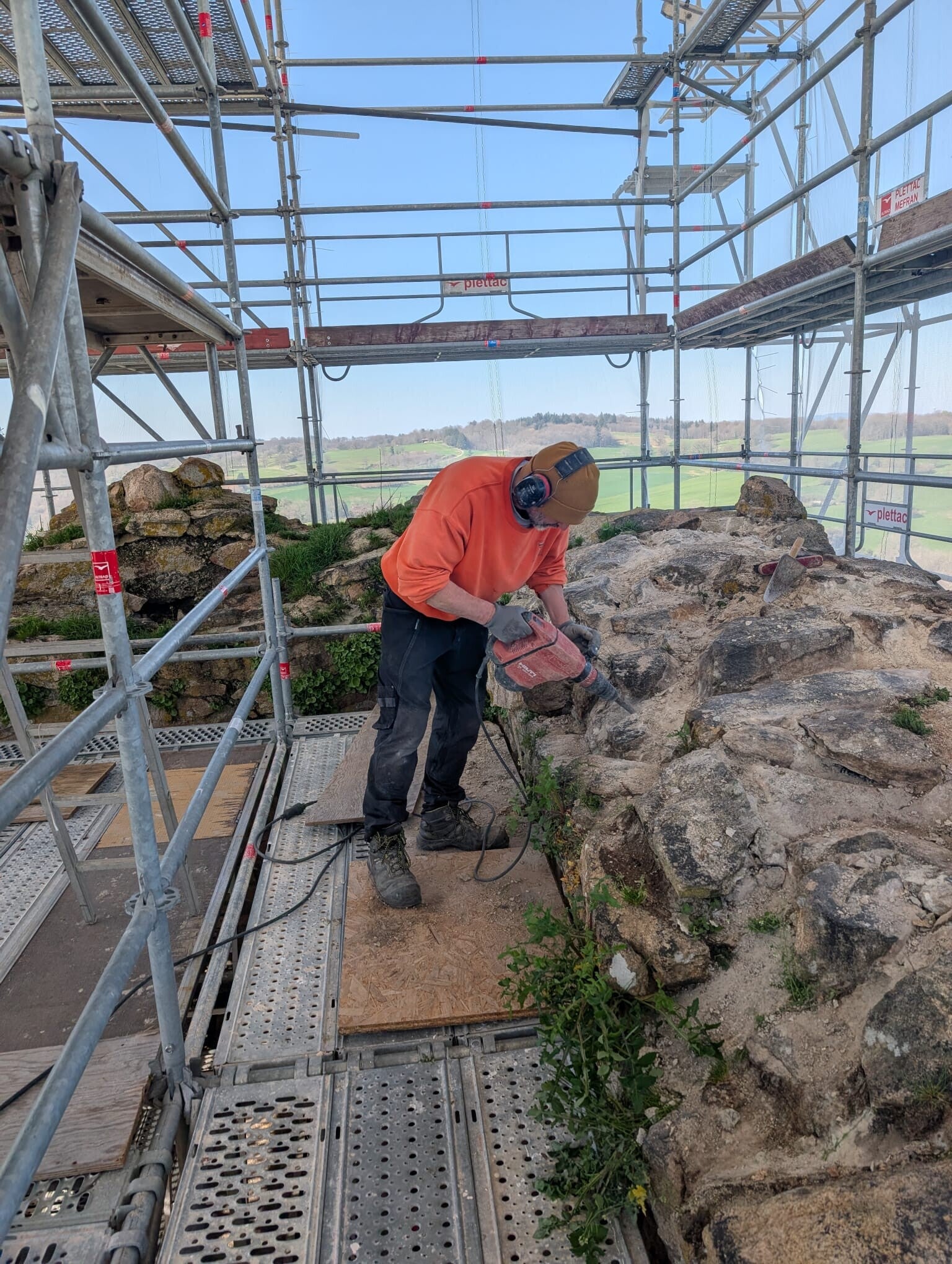 De nombreux travaux de nettoyage sont nécessaires avant d'entamer la reconstruction des murs : les ouvriers doivent enlever la terre et la végétation puis enlever les joints de cristallisation mis en place dans les années 50 puis en 1999 pour consolider le donjon.